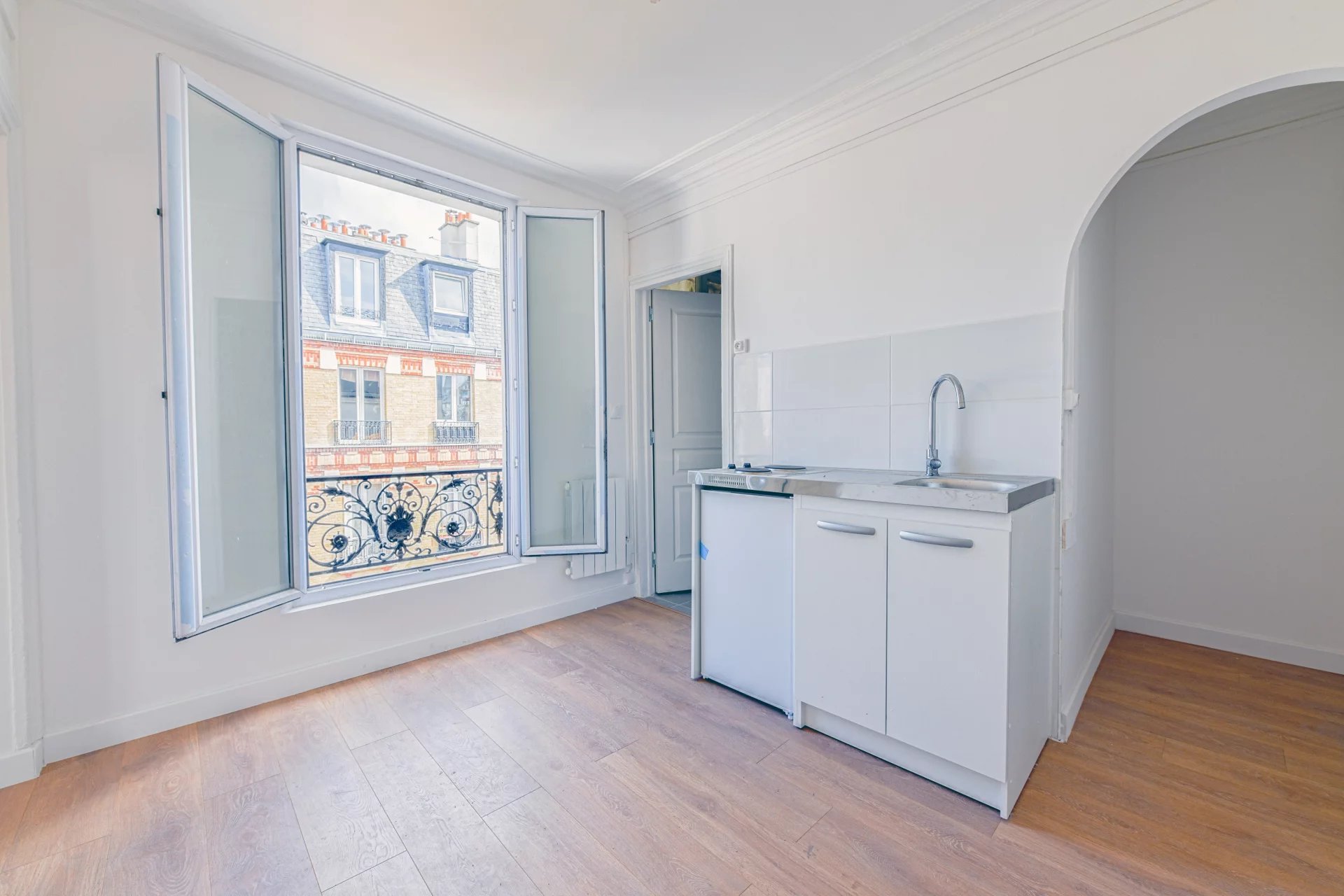 Métro Marcadet-Poissoniers. Au 5e étage sans ascenseur appartement 2 pièces ou F1 refait à neuf, comprenant une entrée, un séjour avec cuisine ouverte, une chambre et une salle d'eau avec wc. Travaux de copropriété à prévoir